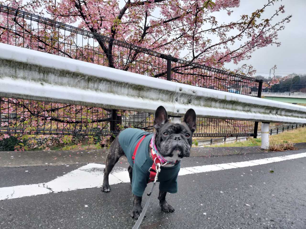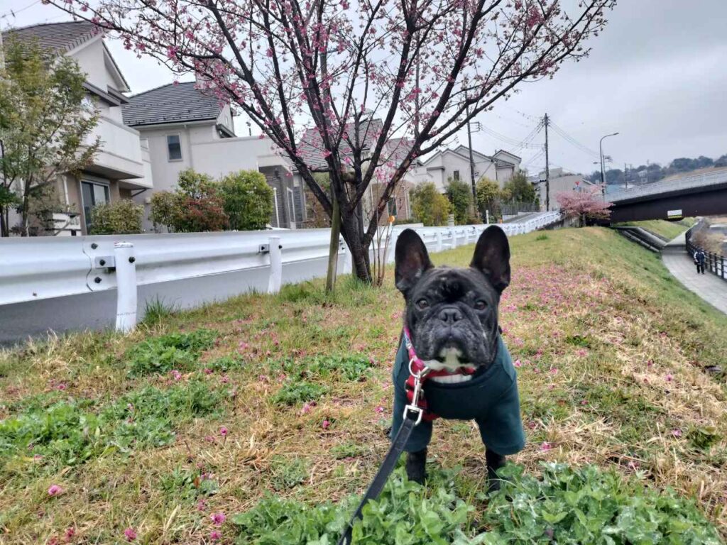 フレンチブルドッグのソル君♪ 犬の保育園BLOG 2026.03.10 今日は朝から冷たい雨が降り、時折雪も交じっていましたね(;^_^A多摩市の12時の気温は4度!真冬です・・・幸い雨は上がり、薄日が差してきましたが、それでも7度!寒暖差が大きすぎますね・・・体調管理にお気をつけ下さいm(__)m 今日の保育園は、フレンチブルドッグのソル君♪ カンザクラが咲いていました🌸