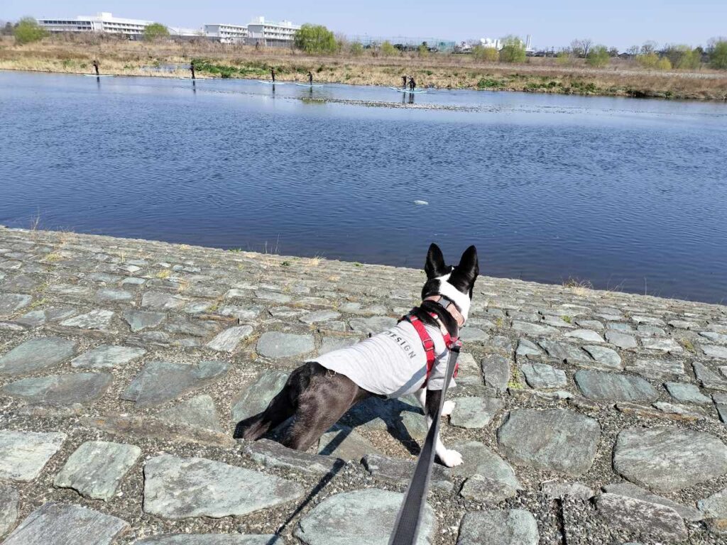 多摩川ではSUPを楽しんでいる人たちがゆっくり川上に向かってパドルを漕いでいました。